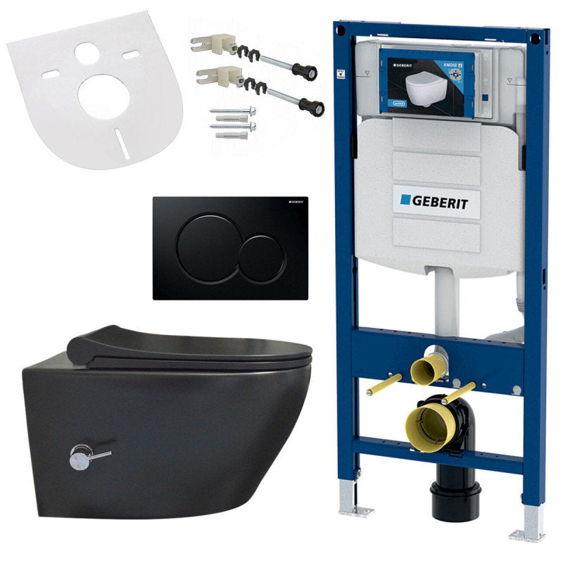 Spülrandloses Hänge-WC mit Armatur, Deckel, Vorwandelement und Betätigun